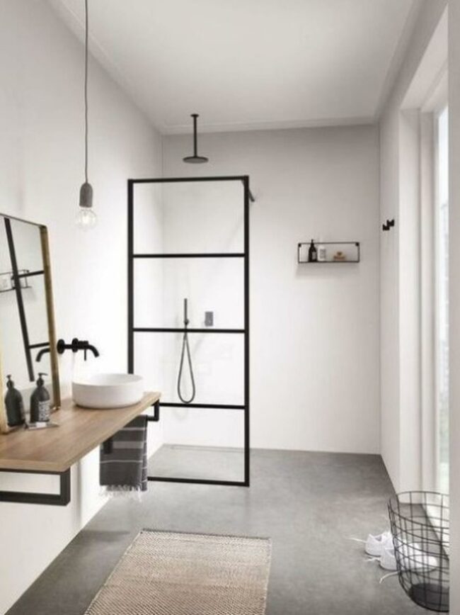 Thin black-framed glass panels define the shower space, promoting an open atmosphere.