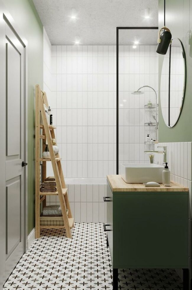 Wooden ladder shelf displays towels and bottles, introducing natural warmth to the space.
