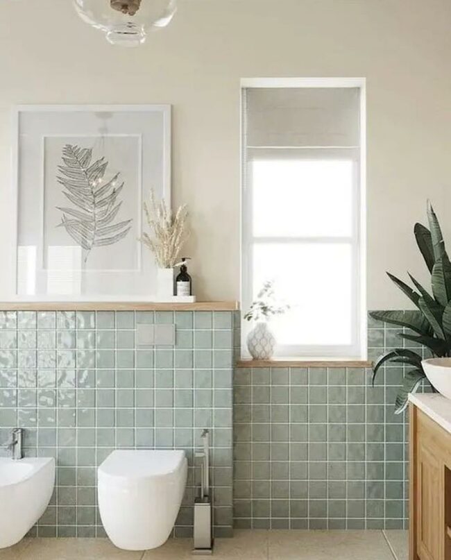 Small green plants perch on the toilet tank and wooden shelf, adding natural life to the room.