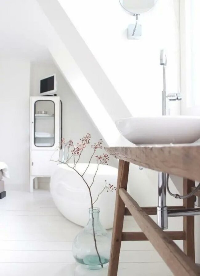Wooden elements like a rustic stool and simple cabinets add warmth against the crisp white backdrop.