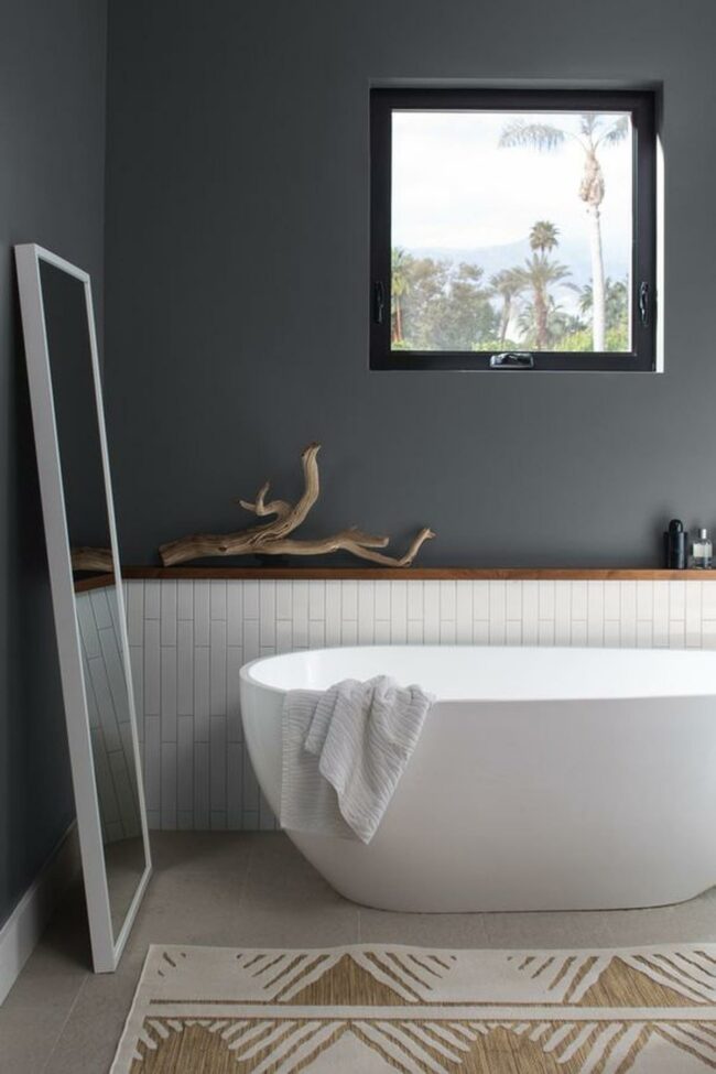 Dark towels draped casually on the bathtub's edge provide elegant visual contrast.