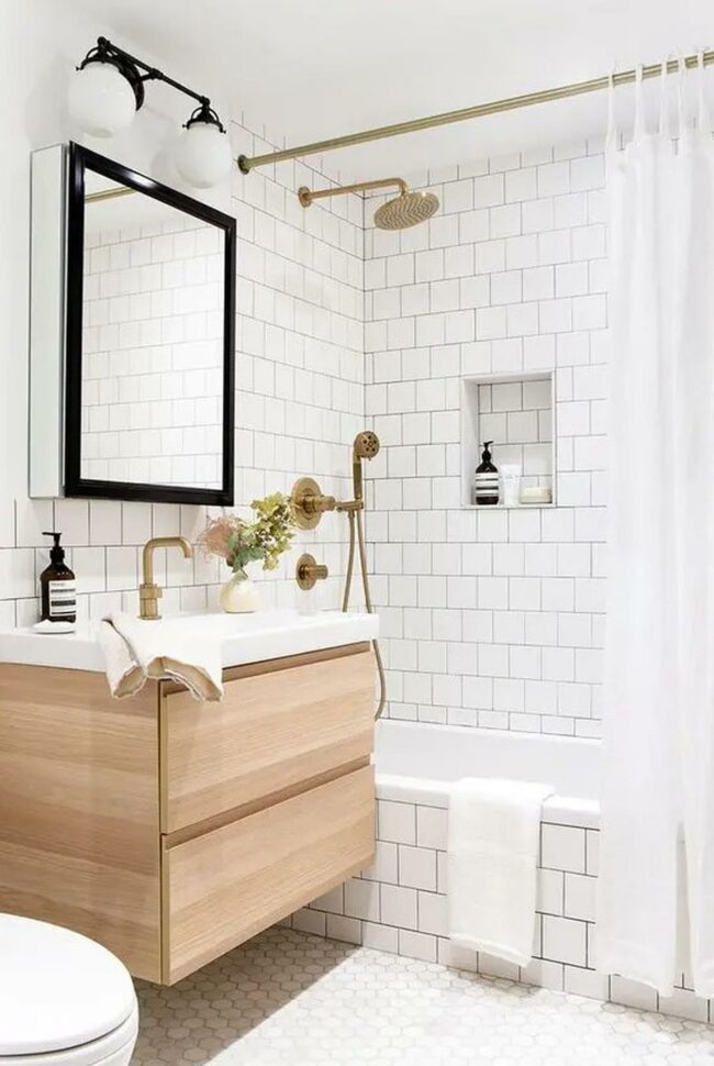 Brass fixtures warm up the clean space with their golden metallic glow.