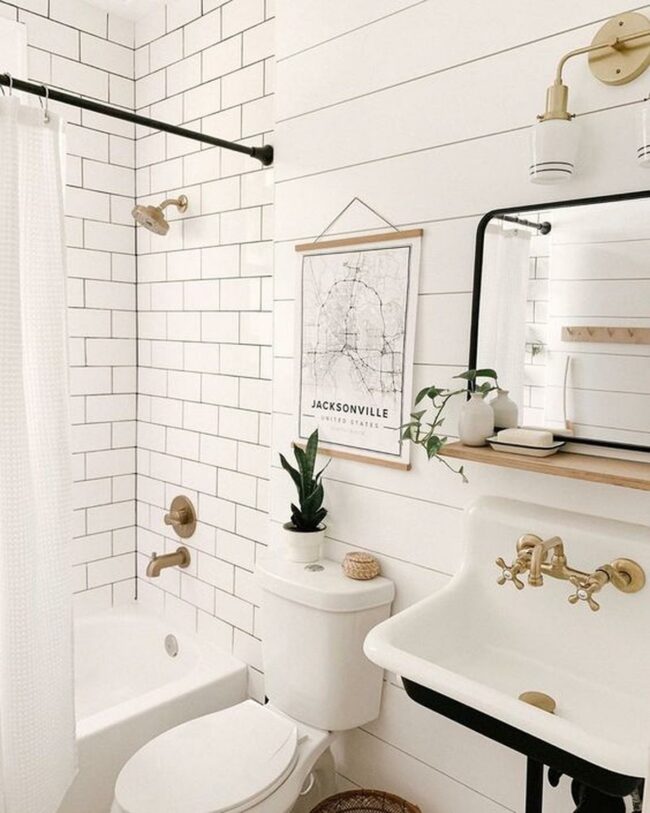 Brass fixtures gleam warmly against crisp walls, adding sophisticated metallic accents.