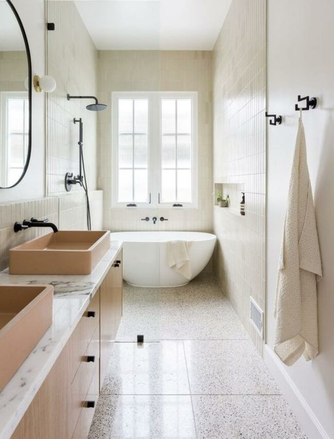 White porcelain bathtubs offer a clean, inviting centerpiece that anchors the area.