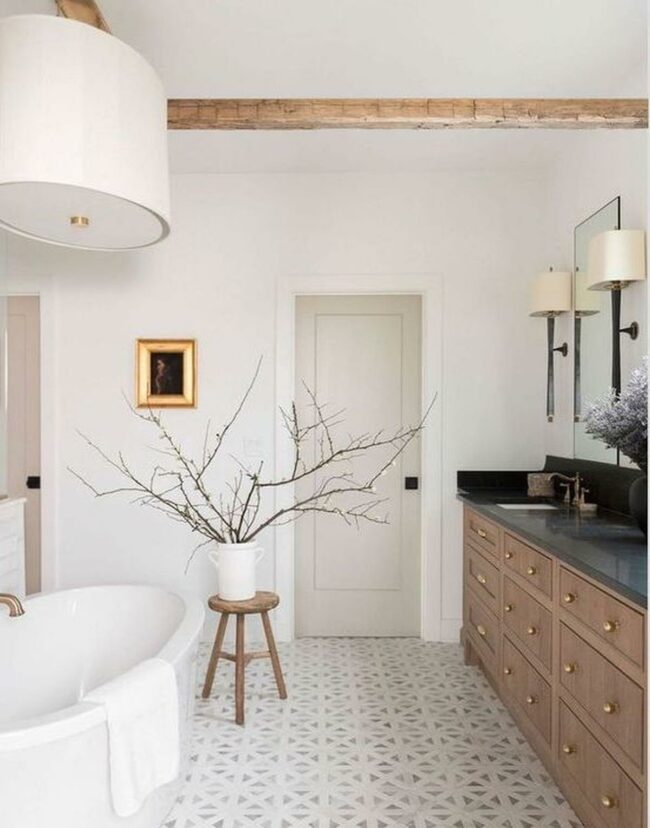 Wooden vanity introduces warmth, softening the cool tile floor's crisp appearance.