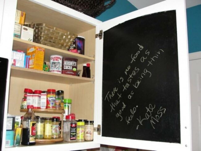 White chalk scrawls a welcoming message inside the cabinet door, adding a personal touch.