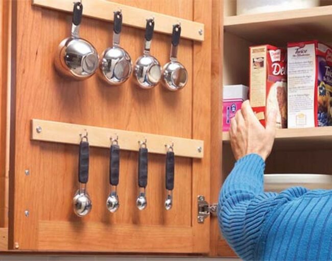 Wooden racks inside doors showcase measuring tools hanging in perfect alignment.