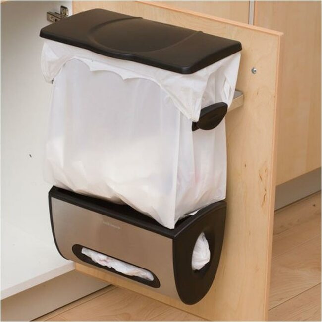 Black and silver frames hold a neatly designed trash bin with a convenient plastic bag dispenser underneath.