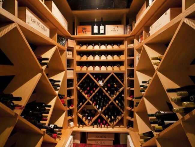 Wooden racks beneath provide additional storage, maximizing the cellar's capacity for wine preservation.