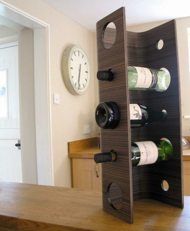 Circular cutouts securely cradle wine bottles, adding playful geometric charm to the design.