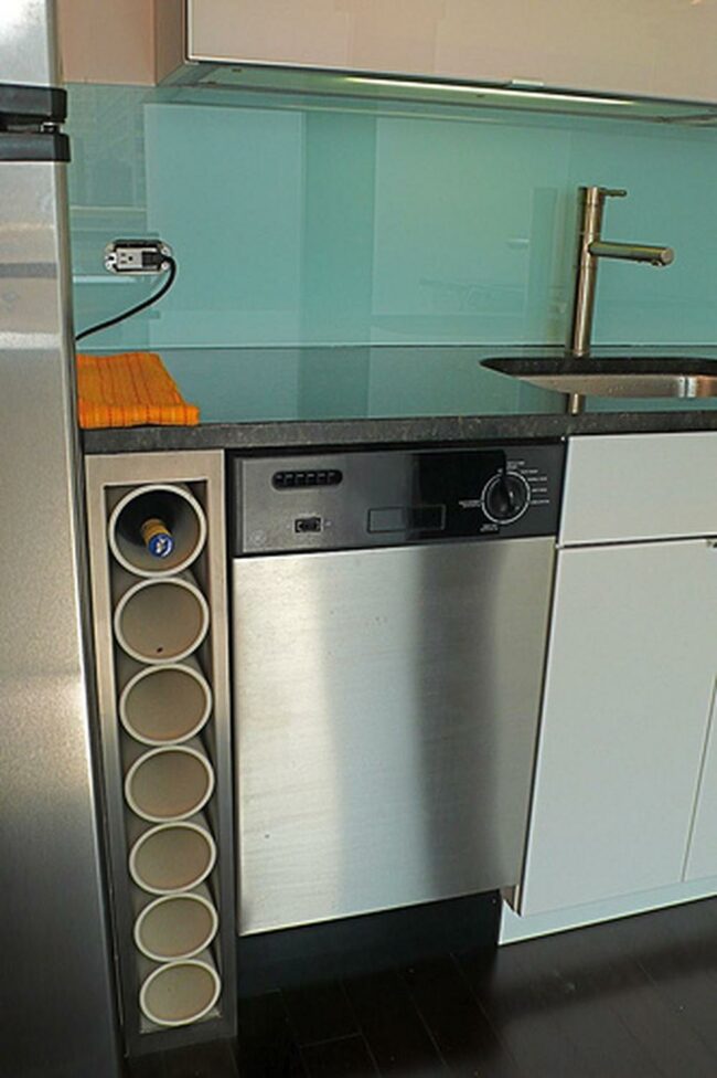 Clever round tube wine rack nestles perfectly beside the dishwasher, adding functional charm.