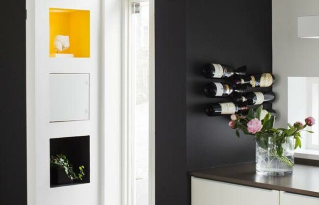 Wine enthusiasts will love this chic kitchen wall showcase where black shelves elevate bottle storage to an art form.