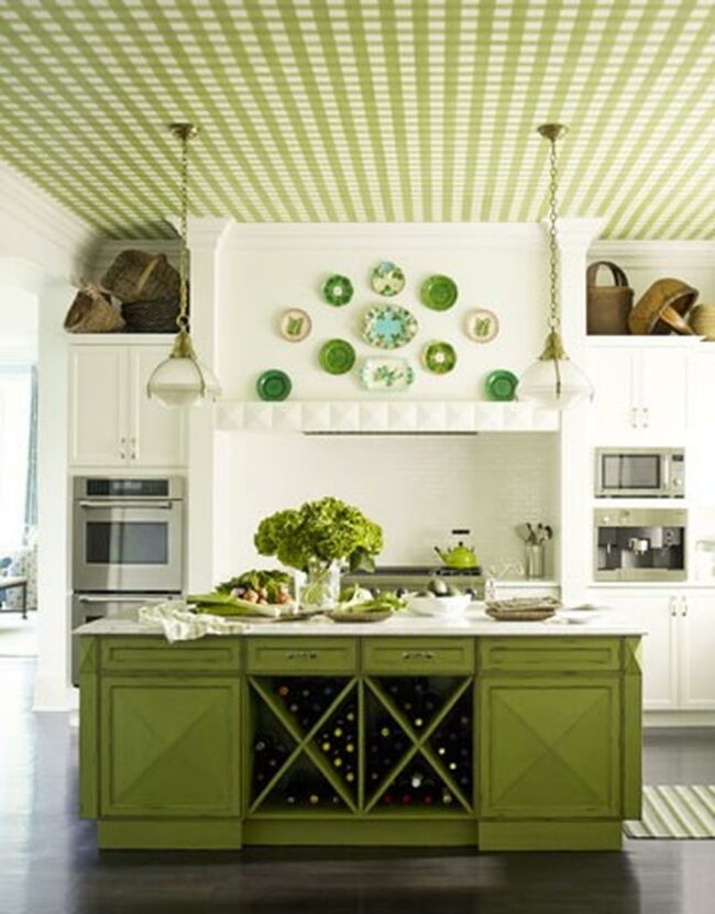 Overhead, a green checkered ceiling pattern adds unexpected visual interest and charm.