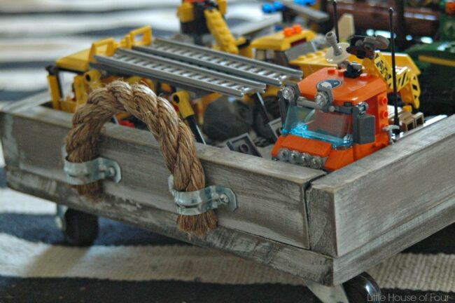 Wooden tray is a rustic playground for toy trucks that sparks imagination and joy.