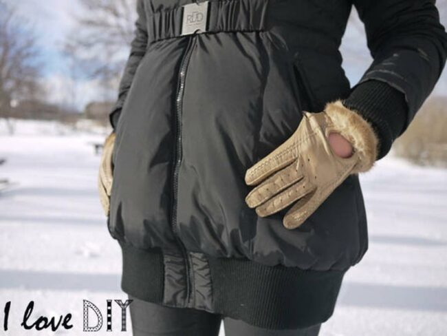 Soft beige gloves complement the outfit, offering extra warmth with their luxurious fur-lined wrists.