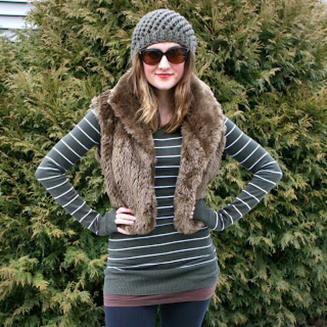 Her ensemble highlights earthy neutrals with a cozy brown furry vest draped over a striped gray and white long-sleeve shirt.