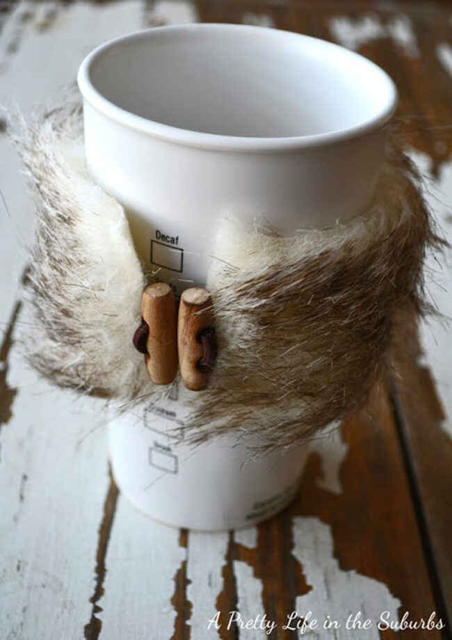 Warm, fluffy fabric in natural brown and cream tones wraps snugly around a white ceramic mug.