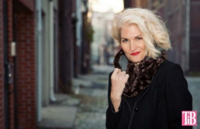 Blonde hair and bold red lipstick amplify her powerful personal statement.