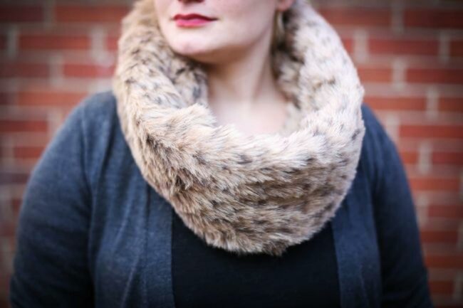 Dark brown fabric wraps comfortably around her neck, creating depth and warmth.