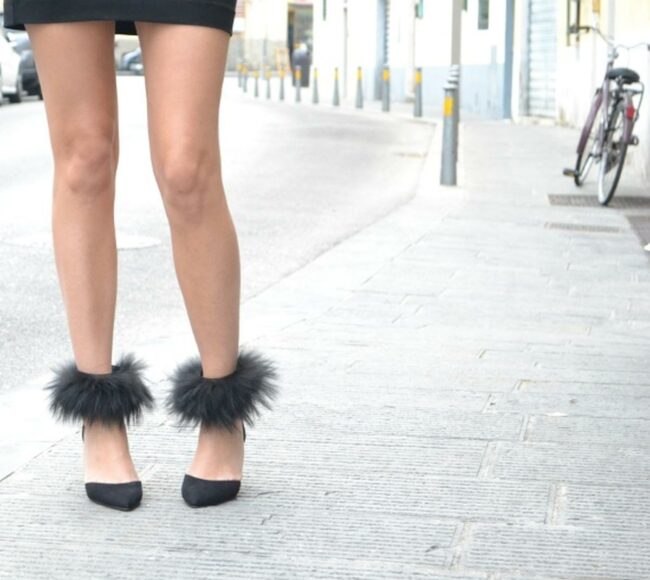 High heels with fluffy black ankle cuffs are a playful fashion statement that turns heads and adds personality to any street-smart outfit.