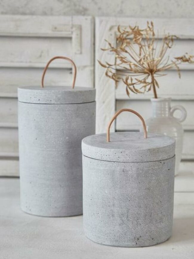 Simple gray containers with leather handles rest beside each other, creating a peaceful display with their stone-like texture and natural appeal.