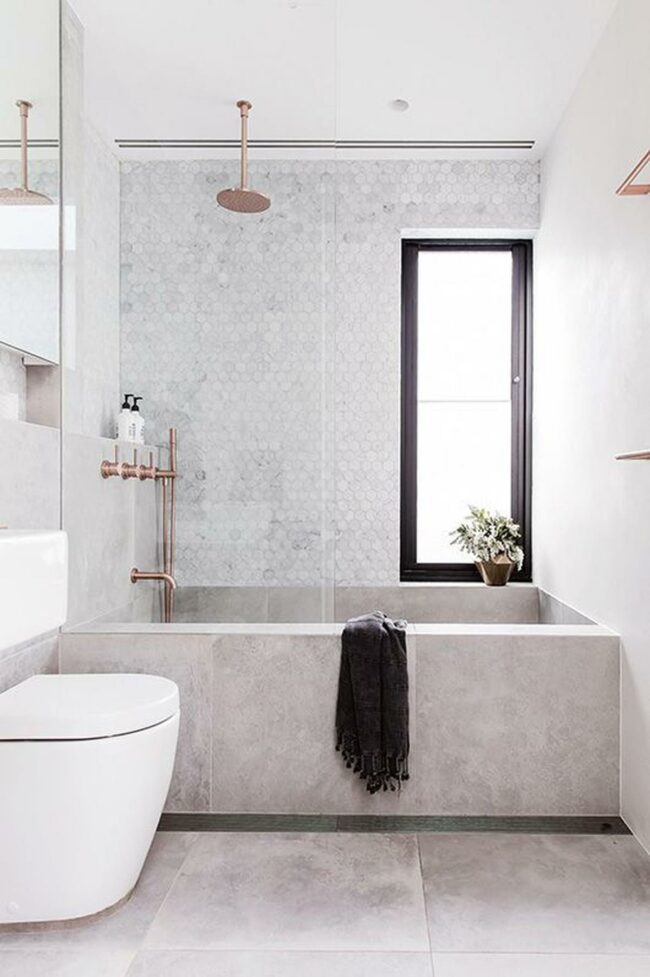 The copper showerhead and faucet bring a subtle warmth that balances the cool tones dominating the space.