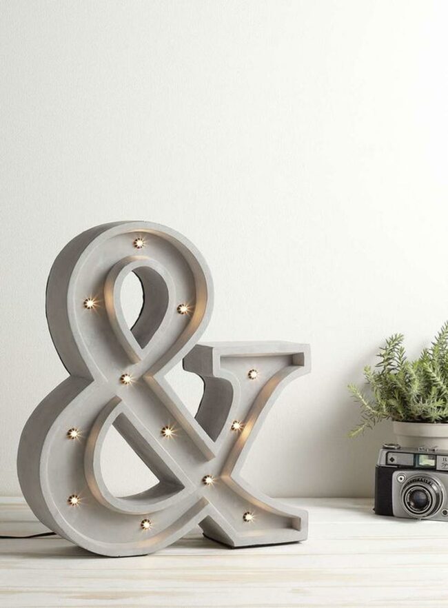 Light wood floors create a fresh foundation in this charming corner where a gray ampersand sign adorned with tiny lights serves as the eye-catching centerpiece.