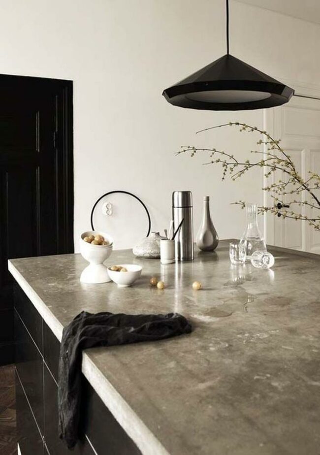 The large concrete countertop offers a smooth work surface that blends seamlessly with the built-in sink for meal prep and cleanup.
