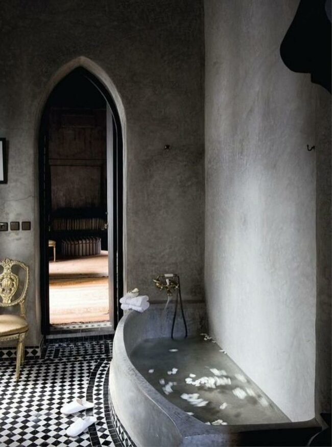 Water in the deep tub reflects gentle shadows on the surrounding stone, enhancing the tranquil atmosphere.