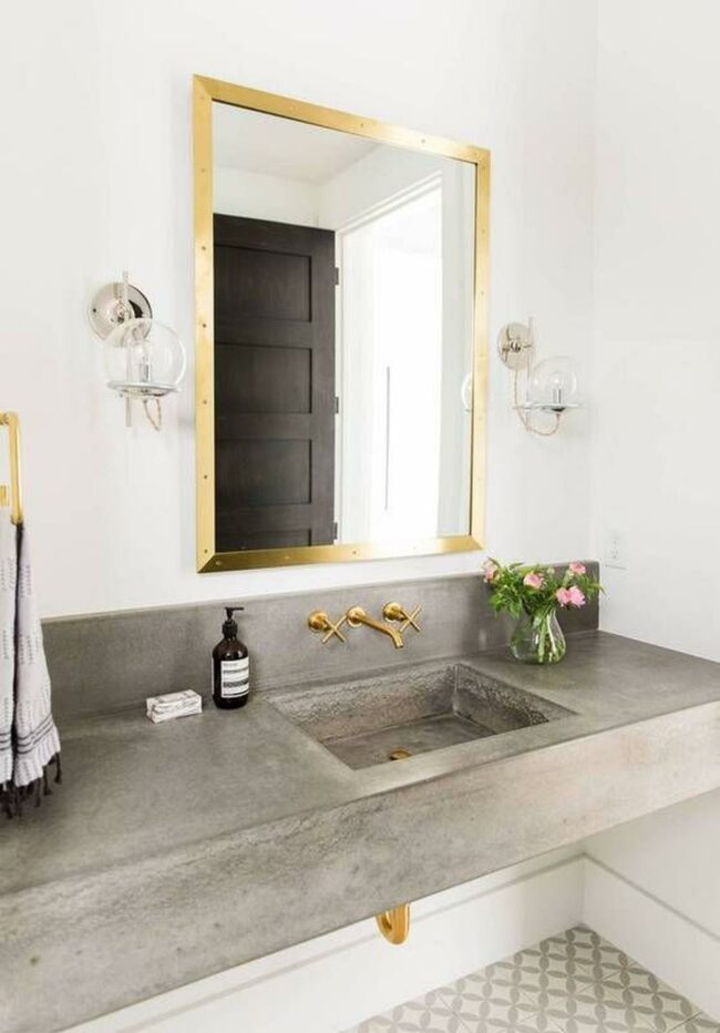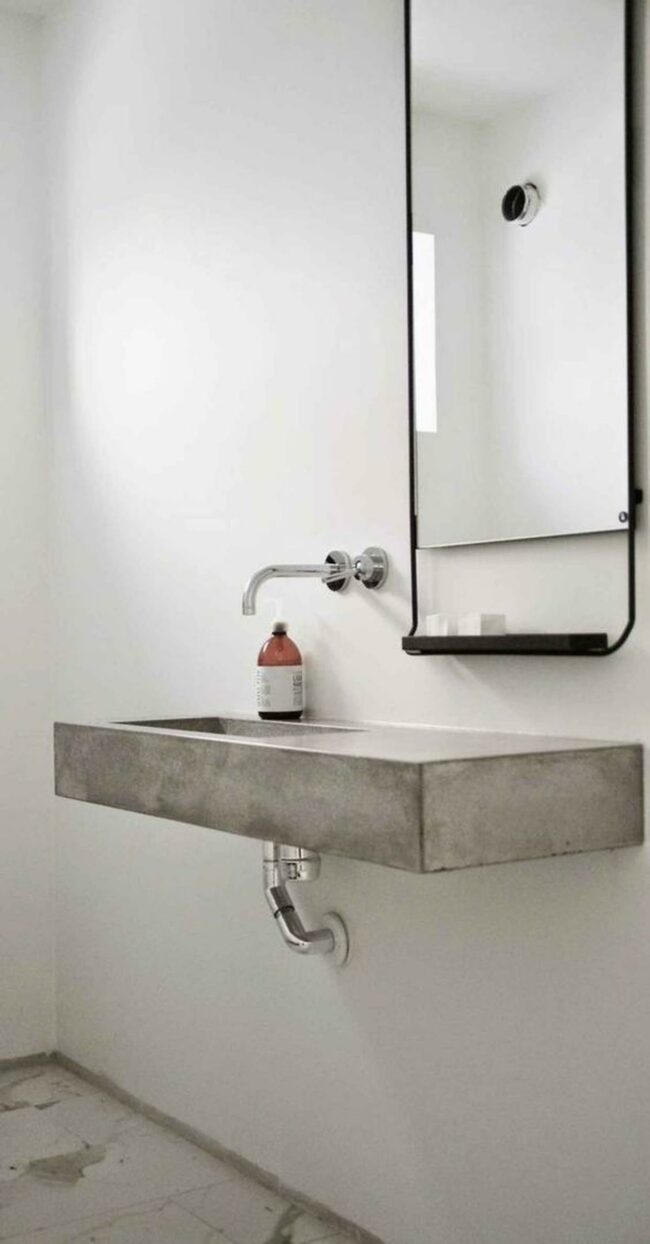 The concrete countertop provides a sleek foundation for the wall-mounted silver faucet, giving the space a contemporary edge.