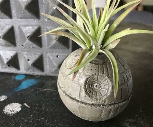Concrete spaceship-inspired planters bring sci-fi charm to any room with their detailed circular design showcasing leafy greens in all directions.