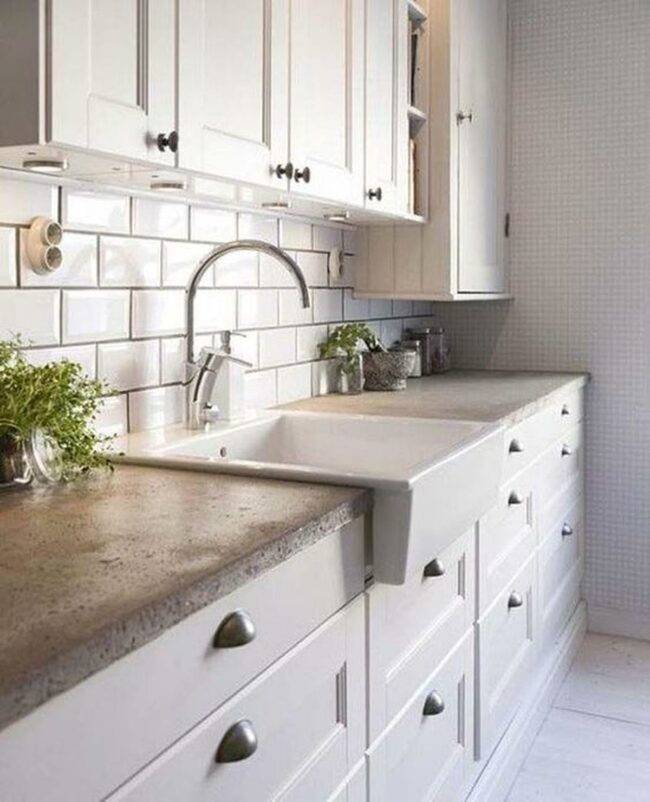 Concrete countertops and matching backsplash create a natural, earthy foundation for this inviting kitchen sink area.