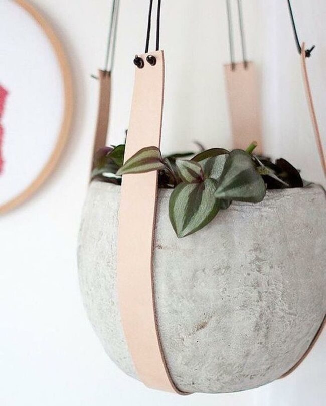 Stunning hanging planters with green leaves create a natural feel in any home while their rough concrete texture adds character and strength to your space.