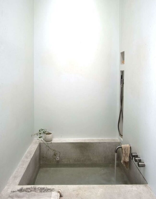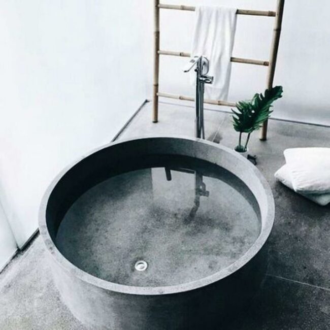 Concrete walls and a matching tub create a calm, peaceful bathroom where you can unwind after a long day.