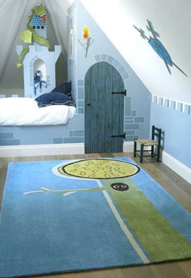 Colorful wall art featuring castles and fairies adds whimsy to the room's playful atmosphere.