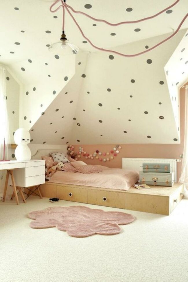 Black polka dots bounce across light walls, injecting personality into the space.