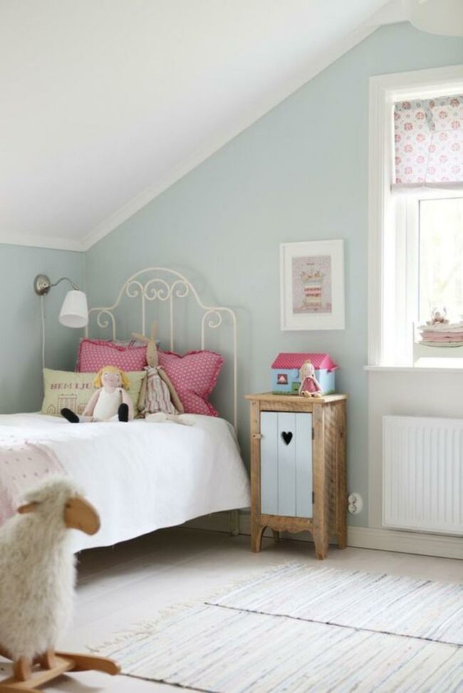 Gentle green walls embrace the space with soothing calm, while a white wicker basket and small dollhouse inject playful character into the room.
