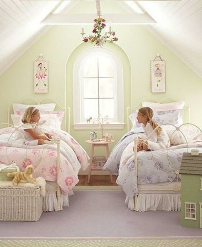 Twin beds in a charming girls' bedroom are a delightful sanctuary of pastel magic and childhood wonder.