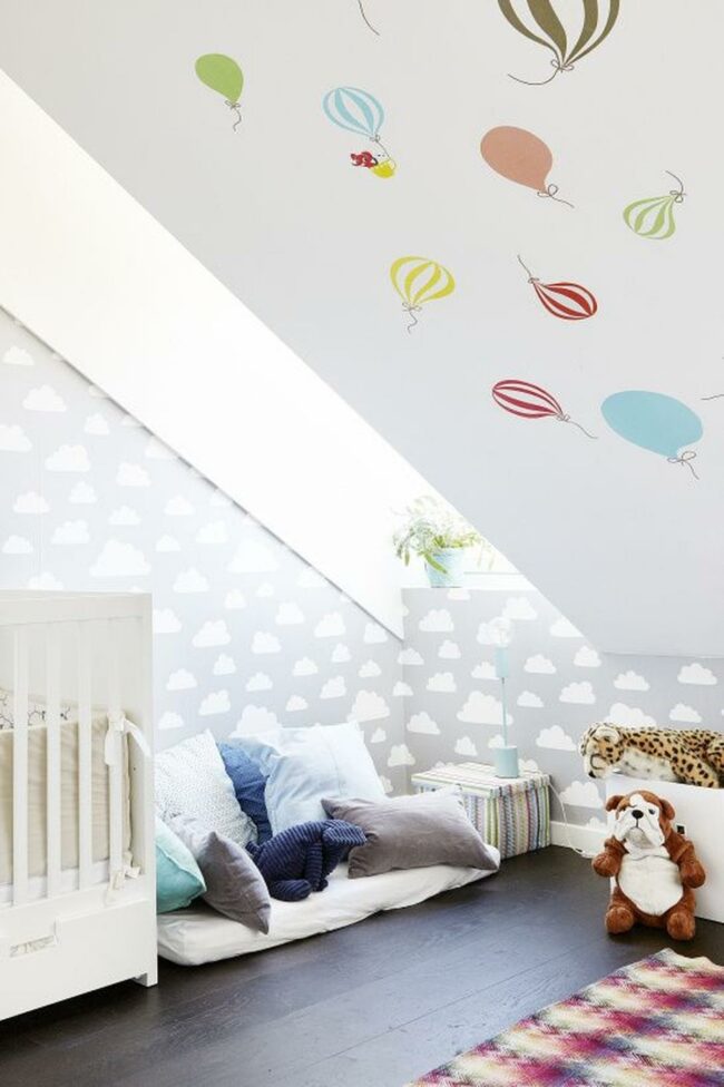 Hot air balloon stickers dance across the sloped ceiling, infusing playful energy into every corner.