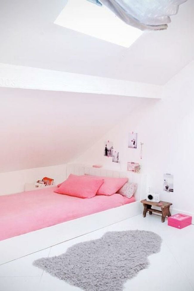 White walls create a serene backdrop for playful design elements like a small bed nestled under a slanted ceiling.
