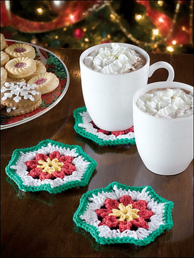 Colorful crocheted coasters in festive red, green, white, and yellow add playful charm beneath steaming drinks.