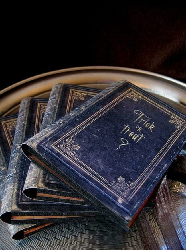 Dark book covers and intricate details suggest a nostalgic Halloween experience.