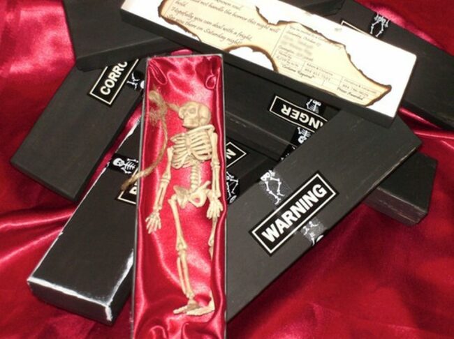 Open boxes reveal surprising contents like a delicate skeleton resting on a crimson cushion, which adds an unexpected layer of intrigue.