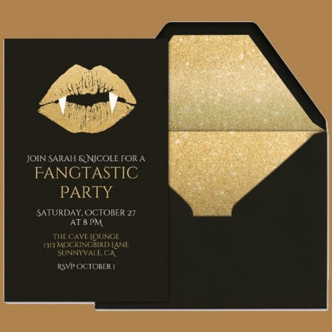 Halloween party invitations are eye-catching with their dramatic black background and gold vampire lip design.