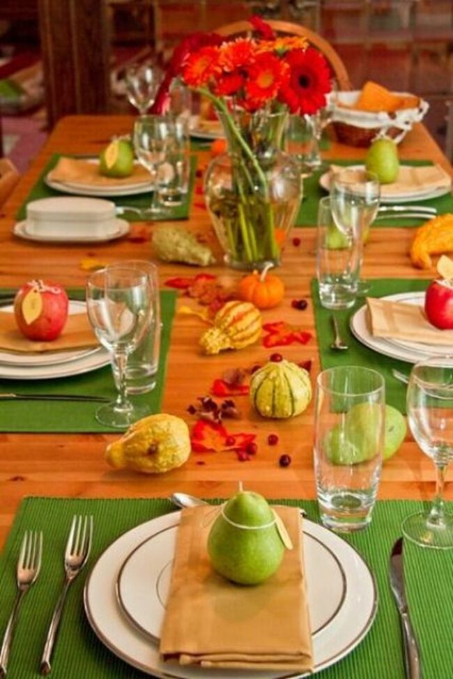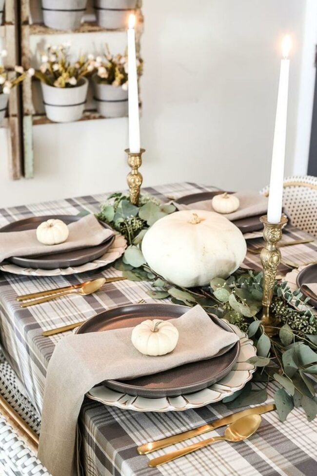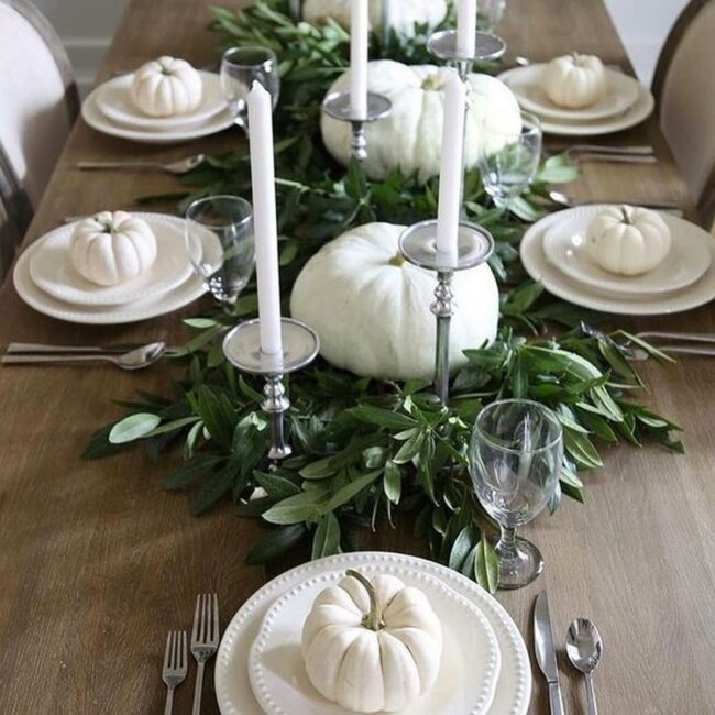 Gorgeous pumpkins in orange, green, and white hues bring autumn warmth to this inviting dining table.