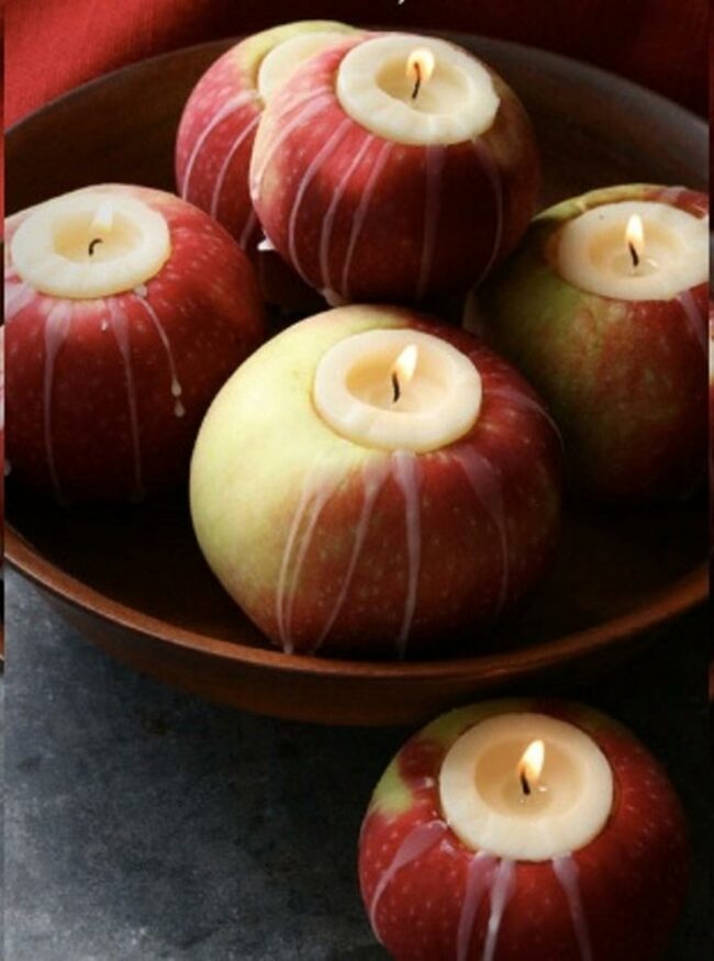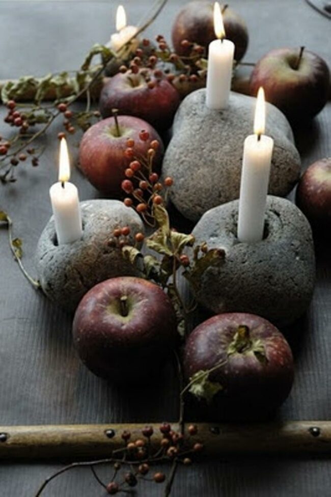 Natural apple candle holders make a charming centerpiece with their red and green hues bringing earthy beauty to any table.