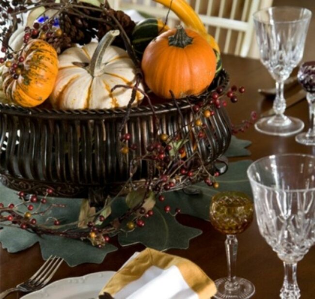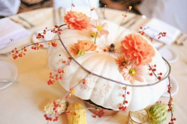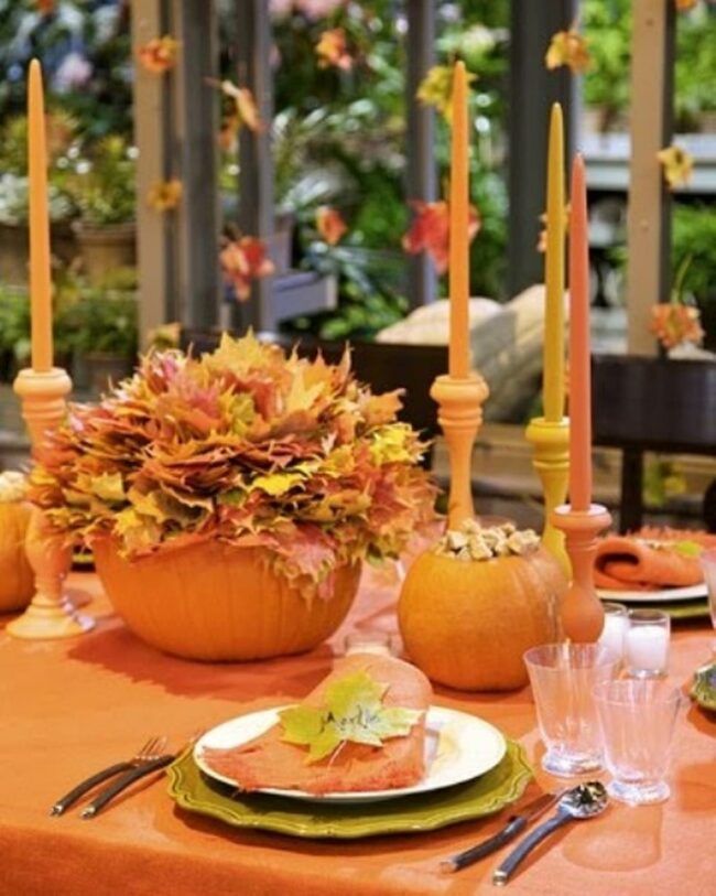 The centerpiece pumpkin overflows with autumn leaves, creating a seasonal focal point that captures the essence of harvest time.