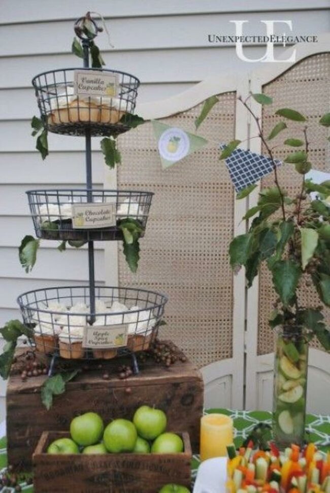 Fresh homemade cupcakes tempt everyone from this charming outdoor display where vanilla, chocolate, and apple cinnamon treats nestle in a rustic three-tiered metal basket.