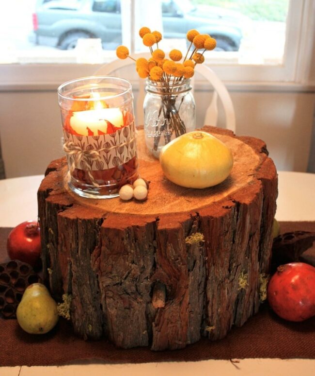 This rustic tree stump centerpiece brings autumn charm to any dining table with its natural wooden base and decorative elements.