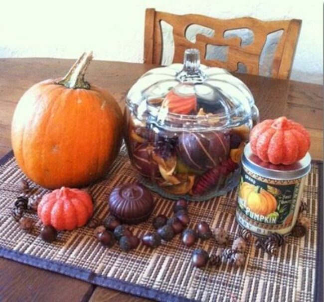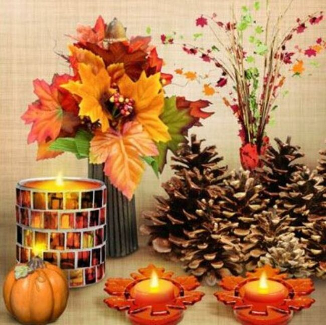 Natural materials such as pinecones, gourds, and fallen leaves can be incorporated alongside fabric accents in deep oranges and burgundies.